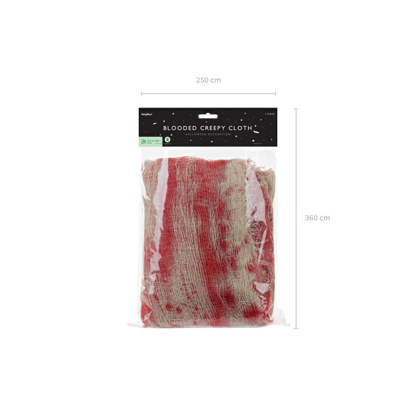 Bílý dekorační materiál s červenými krvavými skvrnami. Rozměry cca 0,72 x 9,8 m. Určeno pro vnitřní i venkovní použití. Složení: polyester - 100%. Návod na údržbu: ruční praní.