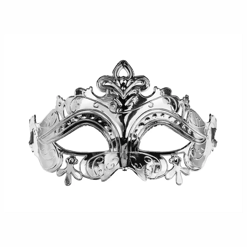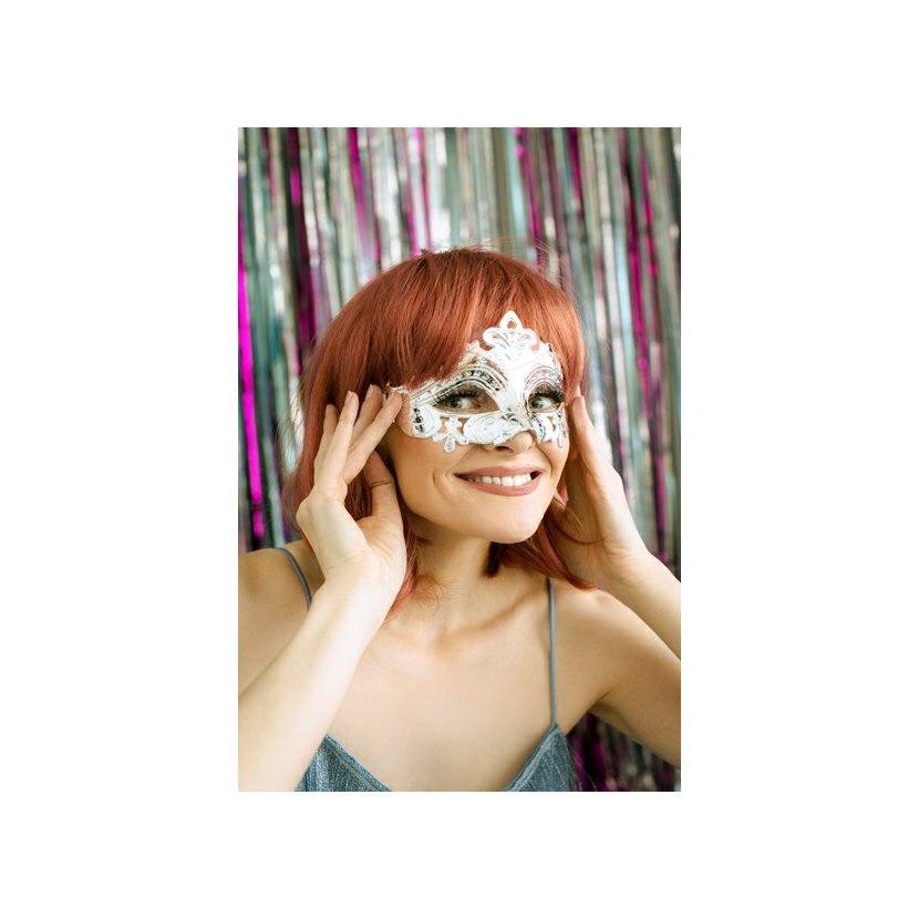 Párty maska ve stříbrné barvě je vyrobena z plastu a opatřena bílou gumičkou. Výška masky je cca 9 cm a šířka cca 17 cm