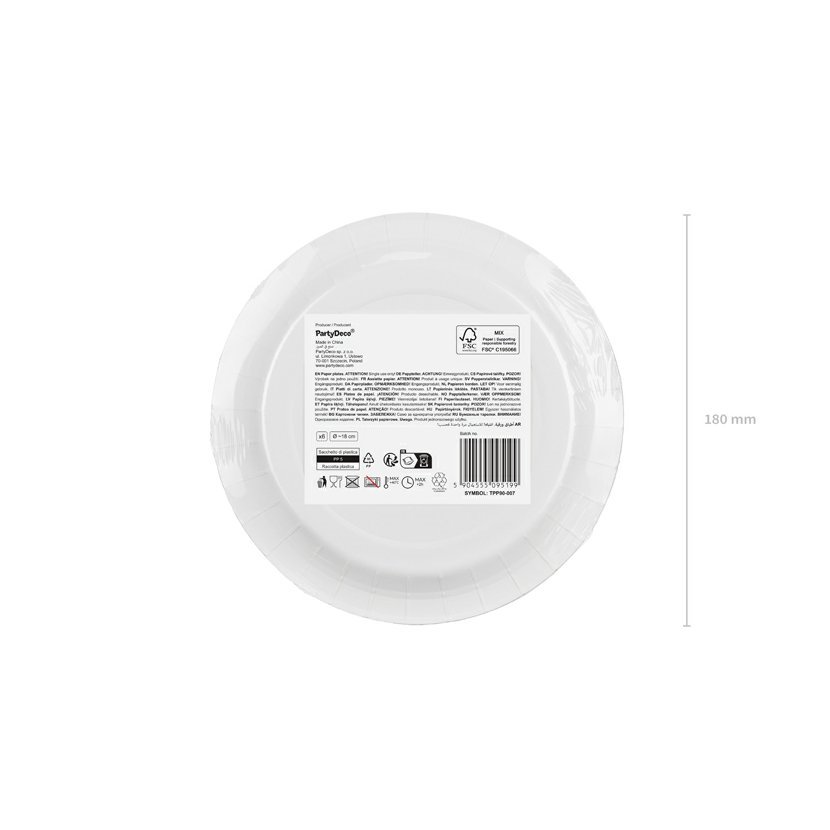 Talířek má průmer 18 cm. Balení obsahuje 6 kusů papírových talířků.